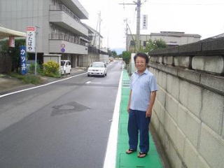| (1) | 陳情・請願の取次 1)陳情取次の成果 米持町住民から「通学路の安全性の確保を図られたい」陳情に対し、須坂市道路河川課、米持町区長と小職との協議により、「歩道として利用している暗渠部分をグリーン色に塗り、運転者に注意を喚起する」ことで合意。ペイント作業は、地元児童との約束通り8月20日までに全ての工事が完了。2学期から児童たちは「緑の歩道」を自分たちの歩道として登下校しております。 ![]() 約600mペイントされた歩道を喜ばれる地元区長。 |